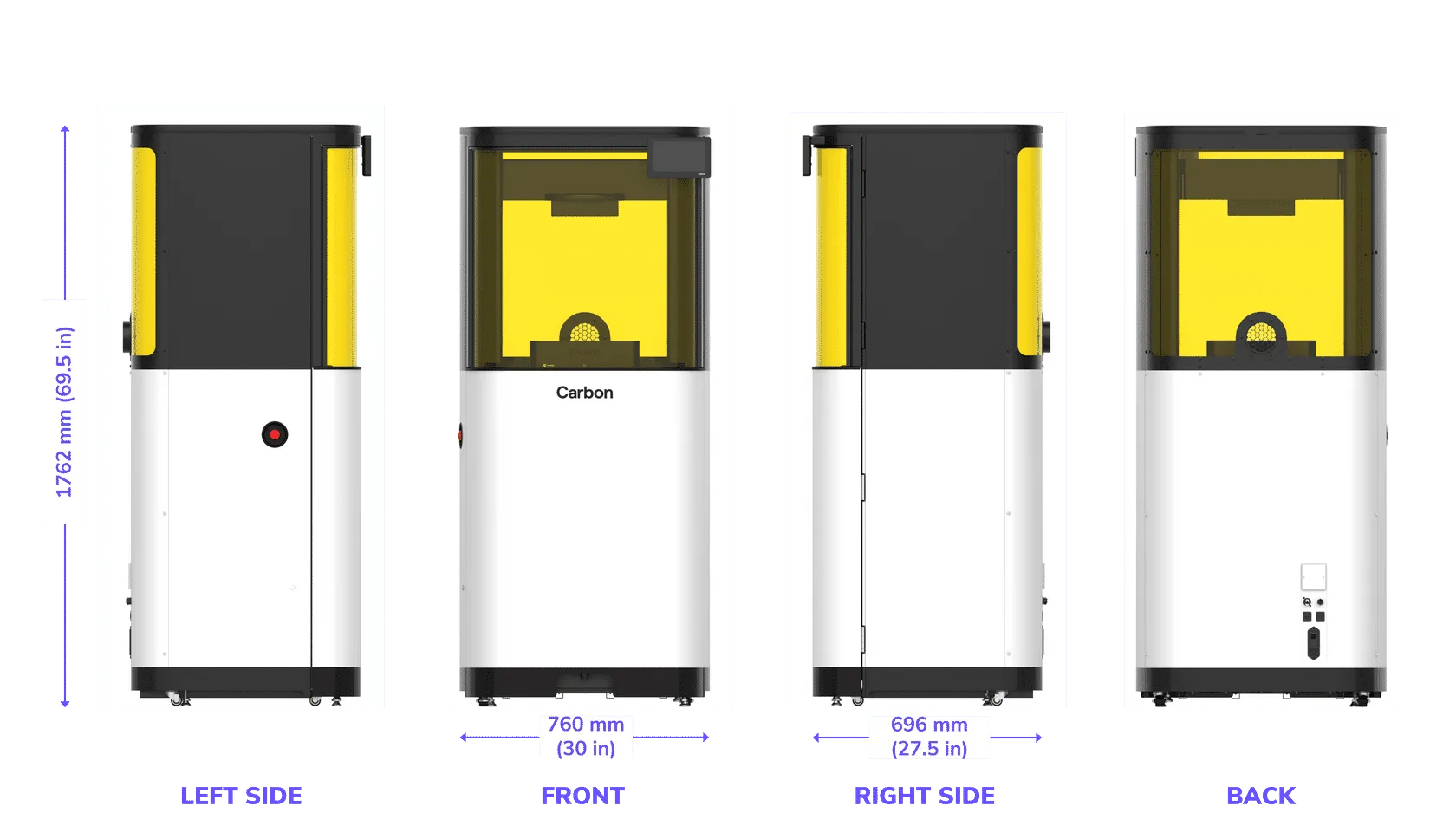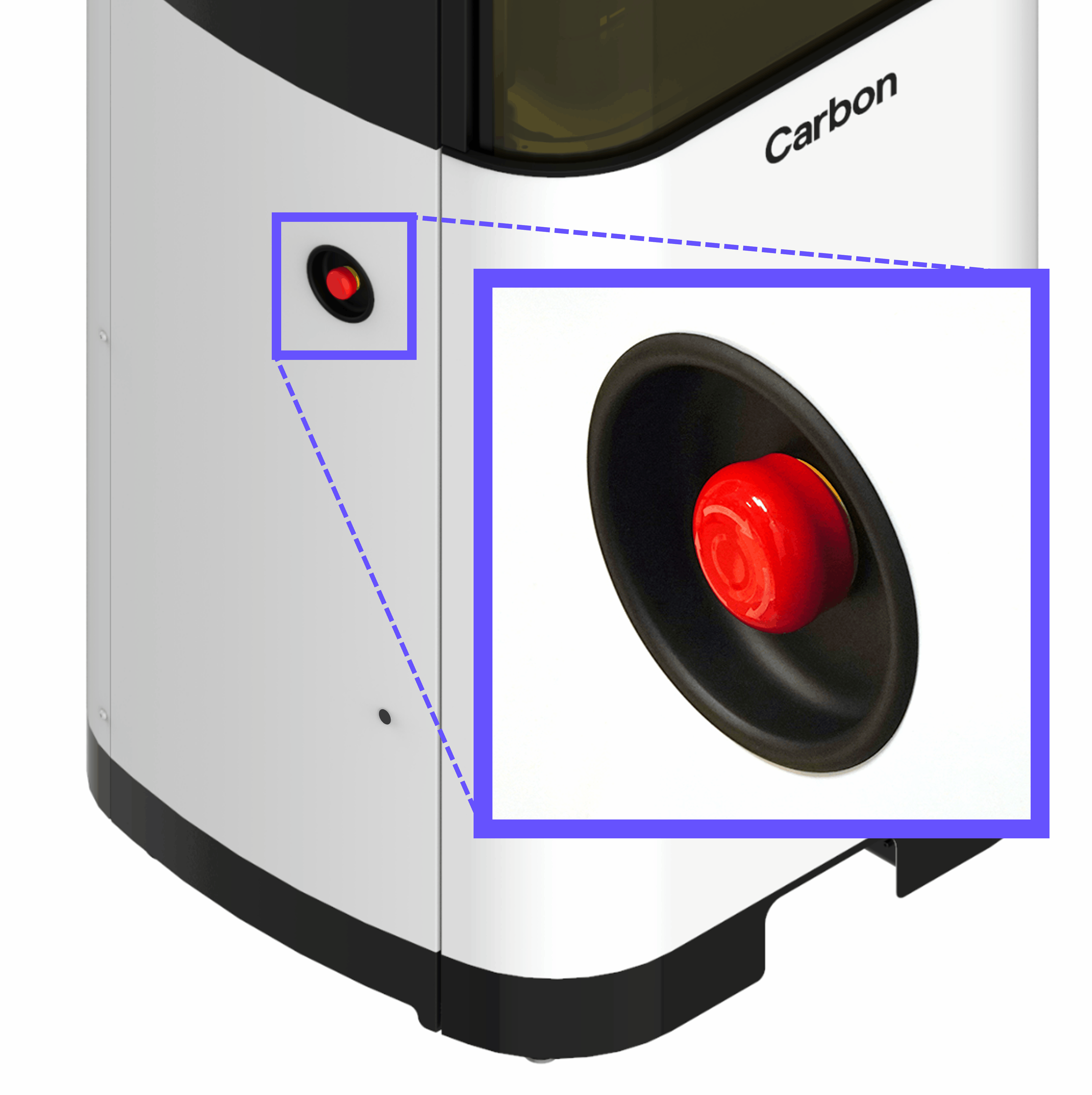 printer stats m3 printer m3 build volume dimensions (w x d x h) 760 x 696 x 1760 mm (30 x 27 5 x 69 3 in) weight 231 kg ( 510 lbs) build envelope 189 x 118 x 326 mm (7 4 x 4 6 x 12 8 in) pixel size 75 µm m3 max printer dimensions (w x d x h) 760 x 696 x 1760 mm (30 x 27 5 x 69 3 in) weight 249 kg ( 550 lbs) build envelope 307 x 163 x 305 mm (12 1 x 6 4 x 12 in) pixel size 75 µm m3 max build volume for information about facility requirements for installation, please refer to docid\ hws1ujvxqpvokv9ymdsu4 or docid\ xckd87zq6nzxz3bsamccb build area parts are printed in the build area operators will primarily interact with components in this part of the printer during daily operation the major components of the build area are platform cassette more information on the build area are provided in a detailed diagram below body the body is the portion of the printer below the build area it is clad with white metal panels foot the foot is the base of the printer there are four built in casters to position the printer there are four leveling feet used to stabilize the printer once in position touchscreen the display shows the printer’s status and has touchscreen functionality for performing basic functions more information provided below printer door the printer door is the curved, transparent yellow barrier that encloses and protects the build area the door moves up and down and is activated using the foot switch located at the foot of the printer the door protects your part from ambient uv light as well as protecting against dust or objects interfering with the printing process the door is disabled during printing and forcing open the door will automatically abort your print foot switch the foot switch, located underneath the front edge of the printer, allows the user to open and close the door by placing their foot under the printer and pushing up on the button pressing and holding the switch will both close the door and start a print when the printer is ready for operation emergency stop button in case of emergency, press the emergency stop (e stop) button when pressed, power will be cut to most printer systems and all printer motion will cease your in progress print will be lost if the emergency stop button is pushed any partially printed parts will need to be discarded and reprinted service door access lock the service door is opened by inserting an 8 mm allen wrench into the access lock hole and turning the wrench an 1/4 of a turn clockwise to release the door open do not turn counter clockwise service door the service door allows access to self service maintenance areas in the printer body build area bridge dimensions (w x d x h) 760 x 696 x 1760 mm (30 x 27 5 x 69 3 in) weight 231 kg ( 510 lbs) build envelope 189 x 118 x 326 mm (7 4 x 4 6 x 12 8 in) pixel size 75 µm the bridge holds the platform and moves it vertically during printing platform the platform is a removable appliance with a flat surface upon which parts are printed rear window the rear is the curved, transparent yellow barrier that encloses and protects the back of the build area the window protects your part from ambient uv light cassette the cassette is a highly engineered optical device that is a critical component of the digital light synthesis™ platform it is a removable appliance that holds the liquid resin used to make parts the window must be properly maintained to ensure print quality improper maintenance or damage to the window will reduce print quality and may result in failed prints and production delays exhaust vent the printer's exhaust vent resides in the rear window at the base of the build area printer deck the printer deck is the flat surface that lines the bottom of the build area the cassette resides on the printer deck projection volume this is an opening in the printer deck that is typically covered by the cassette uv light from the light engine passes up through this space from the printer cavity onto the cassette window more information provided below side covers the build area sides come in three configurations bellows a corrugated cover roller shades a flat sheet of material coverless no covering the bellows and roller shade covers are for cosmetic purposes only to reduce user maintenance, newer printers will not have either cover in place rear connectors during normal use, you shouldn’t need to touch the back of the printer, but you will need access for setup and maintenance do not attempt to open or remove any of the printer panels unless instructed to do so network port standard rj 45 port for connecting the printer to your network via ethernet cable external e stop jumper an external e stop jumper (provided by carbon) must be installed in this port at all times without this jumper in place, the printer will be in an e stopped state without this jumper in place, the printer will be in an e stopped state this jumper also allows the usage of a remote e stop device v1 e stop jumper is user installed (refer to docid\ cuc 4ice6kvrrgvjrfxrj instructions ) v2 compact e stop jumper is pre installed power switch the power switch must be turned on to supply power to the printer select maintenance tasks will require shutting down power with this switch ac power socket power socket for the printer electrical inlet connection iec 320 c19 reserved not for customer use at this time compressed air inlet the printer requires a connection to compressed air air inlet ¼” npt female bulkhead connector exhaust outlet air from the build area is passed through the exhaust at the back of the printer the printer must be connected to mechanical ventilation via a 4 inch diameter duct reserved not for customer use at this time usb port two usb ports are located behind a service panel during printer setup, users will use one of these ports (either is fine) to connect the printer to carbon servers during normal operation or maintenance, this service panel will be closed and not in use cassette the m3 / m3 max printer