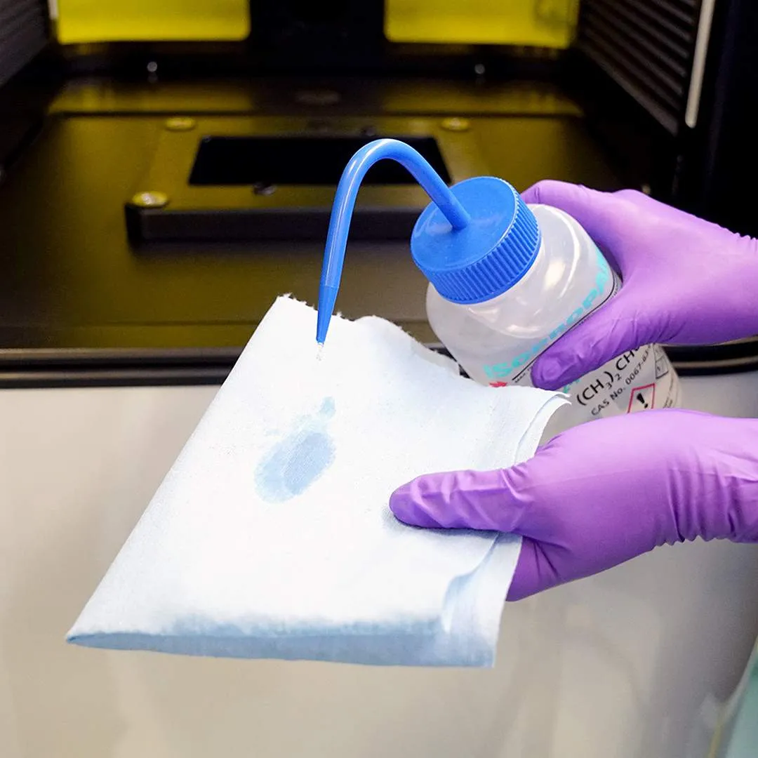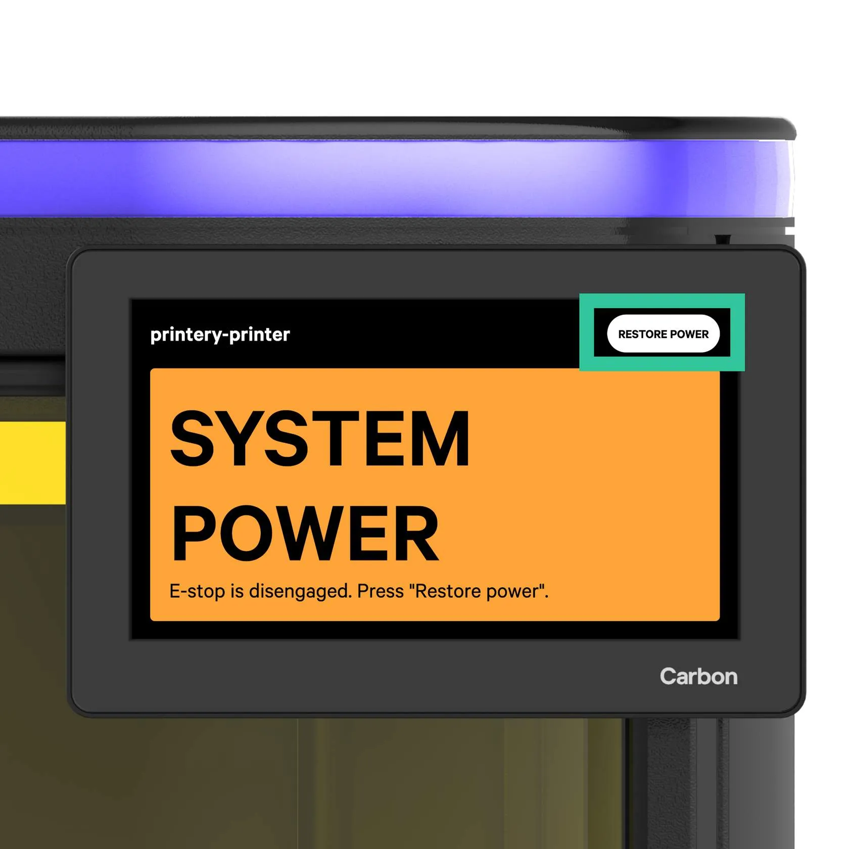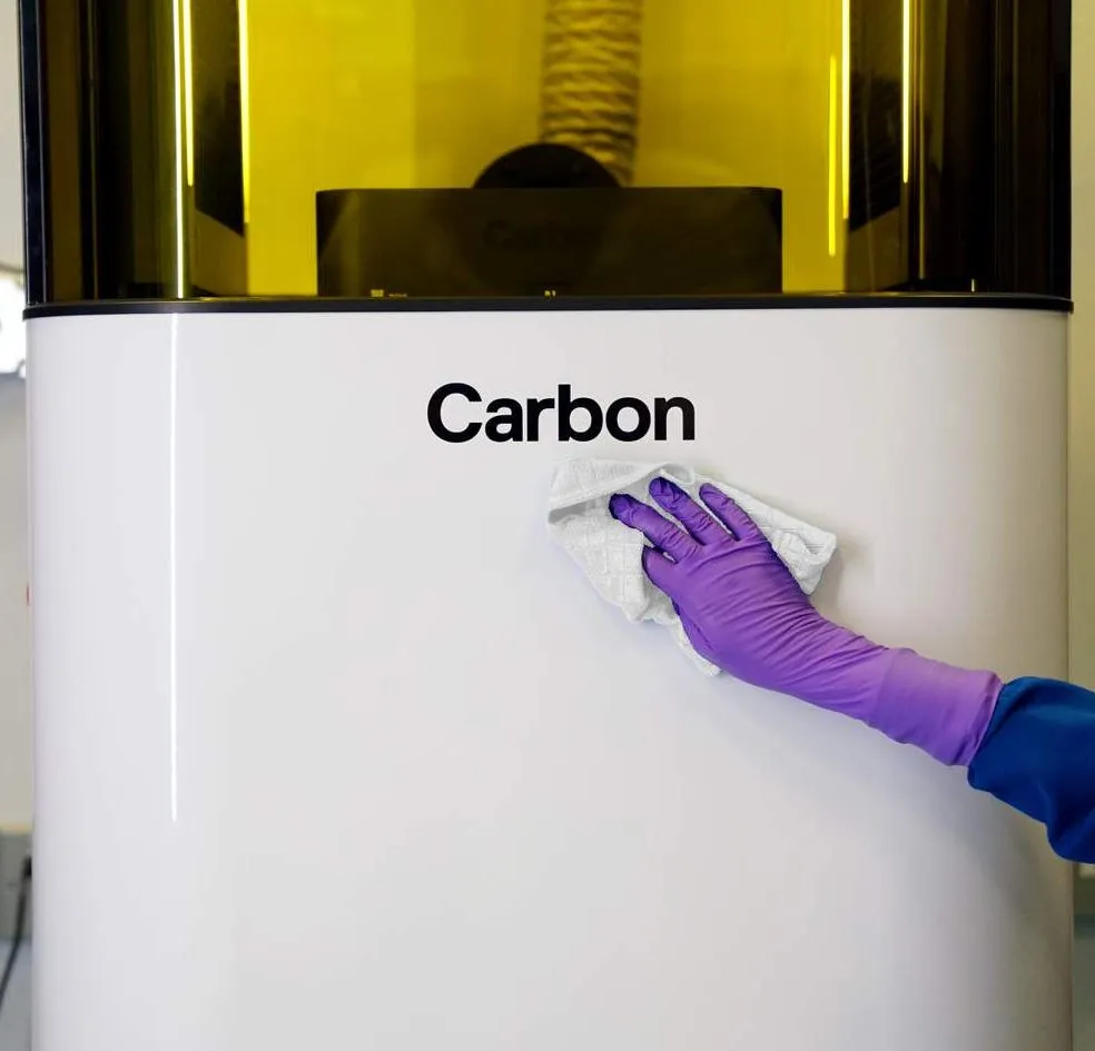 perform these maintenance actions every week /#print head clamp pot /#platform nfc antenna /#deck clamp pots /#heater glass /#spill window glass /#printer door /#front exterior panel /#e stop check /#touchscreen display /#general lab put on clean gloves before proceeding print head clamp pot inspection only a clean clamp pot is important to ensure the proper seating of the platform remove the platform inspect the clamp pot on the underside of the build arm for any resin or debris that will affect functionality pay extra attention to critical areas that interface directly with the underside of the platform circular metal area of the clamp pot recess for platform pin critical areas that interface with platformclean clamp pot if you find a dirty clamp pot with resin or other debris, do not clean the hardware yourself contact mailto\ service\@carbon3d com platform nfc antenna inspection only the nfc antenna is what the printer reads to identify the platform keeping this clean is critical for printer operation remove the platform inspect the nfc antenna on the underside of the build arm for any resin or debris that will affect functionality pay extra attention to critical areas that interface directly with the underside of the platform round area, shown here with the orange circuitry critical areas that interface with platform if you find a dirty nfc antenna with resin or other debris, do not clean the hardware yourself contact mailto\ support\@carbon3d com deck clamp pots inspect deck clamp pots clean deck clamp pots are important to ensure the proper seating of the cassette remove the cassette inspect the 4 clamp pots on the deck for any resin or debris that will affect functionality pay extra attention to critical areas that interface directly with the underside of the cassette black ring around hardware (sits slightly proud of the hardware) recess for cassette pin critical areas that interface with cassetteclean clamp pot clean deck clamp pots if dirty first place the foam insert (included during shipping) or clean aluminum foil on the pedestal to keep any debris from falling into the printer cavity dampen a large swab with ipa, outside of the printer outside of the printer , and blot on a blue shop towel do not apply ipa directly to the clamp pot do not apply ipa directly to the clamp pot clean the clamp pot to remove and resin and dust clean the metal surface and the raised black ring around the hardware clean the recess by inserting the dampened swab if there is cured resin on a clamp pot, or you cannot get one fully clean , contact mailto\ support\@carbon3d com cover the pedestal opening heater glass the m3 / m3 max printer comes equipped with two heaters to provide temperature control for highly viscous resins to improve their flow during printing the heaters are covered with glass to prevent resin from accidentally dripping on heating elements and igniting the heater glass must be clean and free of any resin or particulates for normal printer performance ⚠️ the heaters are connected to the power supply and power must be turned off for safety before servicing prepare printer for servicing remove the platform from the homed position remove the cassette power down the printer remove the platform from the homed position remove the cassette power down the printer press power switch to the off position ⚠️ burn hazard the heater may be hot allow to cool 15 minutes after last print before servicing locate heaters heaters reside at the front and back of the projection volume, below where the cassette sits heaters sit partially underneath a short overhang of the deck heater glass clean, undamaged, securely installed inspect heaters for resin, dust and debris | action clean glass for cracked or chipped glass | action replace glass for proper installation | action secure glass glass properly seated on ledge glass properly seated on ledge clips positioned over glass clips positioned over glass resin and dust on glasscracked glass glass not properly seated on ledge glass not properly seated on ledge clips not positioned over glass clips not positioned over glass cleaning heater glass in printer dust or small drips of resin may be cleaned without removing glass from the printer if you can reach the area lightly dampen a blue shop towel with ipa, outside of the printer do not saturate the towel to the point of dripping solvent do not saturate the towel to the point of dripping solvent reach into the opening, and wipe the heater glass with the towel, until it is clean, dry, and without streaks use a light touch to protect the glass removing heater glass to clean, replace, or secure larger resin spills, especially dirty glass, or damaged glass will need to be removed for cleaning or replacing this video also shows how to properly secure the glass if a resin spill has dripped beyond the glass itself, contact mailto\ support\@carbon3d com video text 1 locate two glass securing spring clips 2\ push and rotate clips outward to free glass 3\ carefully remove the glass cover \ tilt glass to remove it from printer cavity be careful to avoid the ir sensor when removing 4 clean both sides of glass with ipa \ dampen a blue shop towel \ until clean, dry and streak free 5\ carefully replace glass inside printer's heater \ tilt glass to replace it in printer cavity \ ensure glass rests on metal clips on each side of reflector \ press down metal bar at center of assembly to sit below glass \ hold glass in place with thumb \ push and rotate clip back over glass \ push and rotate 2nd clip back over glass the heater glass is tempered for safety and to increase durability, but it is still susceptible to breaking if not handled with care the printer will not operate if the heater glass has not been properly secured in place restore printer power power printer back on restore system power power printer back on press power switch to the on position restore system power press restore system power on the touchscree