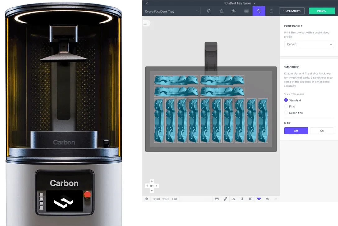 overview this resin is designed for printing custom full and quadrant maxillary and mandibular arch impression bite trays for use with pvs, vps, and alginate impression material systems a robust formulation yields a final product having excellent surface finish, accuracy, and material properties resource links https //www carbon3d com/materials/rodin bite tray resin https //rodin 3d com/instructions/ifu bitetrayresin pdf https //rodin 3d com/instructions/sds/sds%20 rodin%20bite%20tray%20resin pdf protocol this downloadable handout provides important usage information, including instructions about storage, washing and curing print it out and bring it into the lab! dental post processing grids one of our most popular downloads! this table provides washing and curing instructions for all supported dental resins print it and use it in the lab as a quick reference images of dental post processing grids english german/deutsch spanish/español digital preparation connect to printer connect to the printer using your web browser open browser carbon recommends the latest version of google chrome type https //print carbon3d com/ in the url field carbon recommends bookmarking this site for later use if you are not automatically logged in, enter your email and password and click log in enter your email and password and click log in if you have multiple printers, click the printer that you wish to use click the printer that you wish to use import parts click new project you can also drag your files from a file browser window and drop it on top of the new project icon enter a new project name in the resin dropdown for aox indications, select pac dent rodin bite tray toggle auto nest dentures off only use encrypt project if you want to require a password to access the project note carbon cannot provide support for encrypted projects drag and drop your files into the dotted box dotted box or click browse your files and select them in a file browser window click create after a few moments you will see the main printer interface with your dentures on the platform orientation orient the impression trays vertically with tab on platform orient the impression trays vertically with tab on platform this orientation yields the best accuracy, requires the fewest supports and allows the most parts per build snap to platform the snap to platform feature enables automatic alignment of a selected surface with the platform this feature is the best way to quickly and accurately orient the flat side of the tab to the platform click orient orient or shift + o in the main bar in the printer software click select surface select surface the button will change to done click on the flat underside surface flat underside surface of the part that you want to align with the platform click on done to exit snap to platform tool supporting enter support mode supports hold up the part during printing they do this by connecting platform facing surfaces to the platform click support or shift + s support or shift + s in the dark gray bar at the top of screen under position , select on platform on platform to lift parts off the platform under auto support method , select basic basic click generate generate to automatically create supports this may take seconds or minutes depending on the complexity of your part note we recommend using the basic support method instead of advanced for impression trays the advanced method’s fea processing takes about 30 minutes for each tray typically, using basic auto supports and manually editing takes 5 20 minutes based on skill level with no drop in part quality check the supported tray the auto support function aggressively adds supports to your part in order to ensure print success since supports leave small bits or nubs after removal, they reduce part accuracy therefore, supports usually need manual editing to eliminate them from important surfaces and features examine your newly supported model note any supports that contact any intaglio surface contact any intaglio surface contact any other critical feature use the edit edit feature to remove any unwanted supports edited supports these are before/after images of the tray before editing and after editing before editing many supports on intaglio surfaces before editing many supports on intaglio surfaces after editing no supports on intaglio surfaces after editing no supports on intaglio surfaces fence supports fences work well for impression trays they are easy to remove they do not increase the footprint of the part, which allows more trays to be built at once click on fences fences click a series of points series of points on the tray to define the fence use overhang detection overhang detection to find areas that need support click generate generate to create the fence geometry repeat as needed carbon recommends running fences every 2 4 mm on horizontal or near horizontal surfaces well supported trays this is an example of an impression tray that is well supported with fences supported on the platform provides stability lower than printing above platform so print times are shorter fewer supports require less resin intaglio surfaces are free from supports print controls do not change any of the settings under print controls the default settings deliver the best results for impression trays slicing slice thickness should stay at standard (100 µm) standard (100 µm) reducing the slice thickness by choosing the fine (50 µm) or super fine (25 µm) settings will dramatically increase print time and may reduce part quality and accuracy project analysis select the project analysis project analysis tab click start analysis and wait for the processing to complete note the required resin volume and print time click add to queue manufacturer instructions for use https //rodin 3d com/instructions/ifu bitetrayresin pdf questions & support rodin bite tray for questions about the resin properties, printing, washing or curing your impression trays, please conta